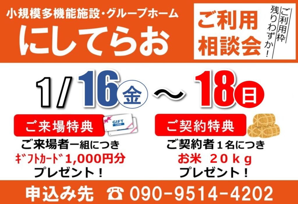 小多機・グループホームにしてらお「ご利用相談会」(1/16(金)~18(日))