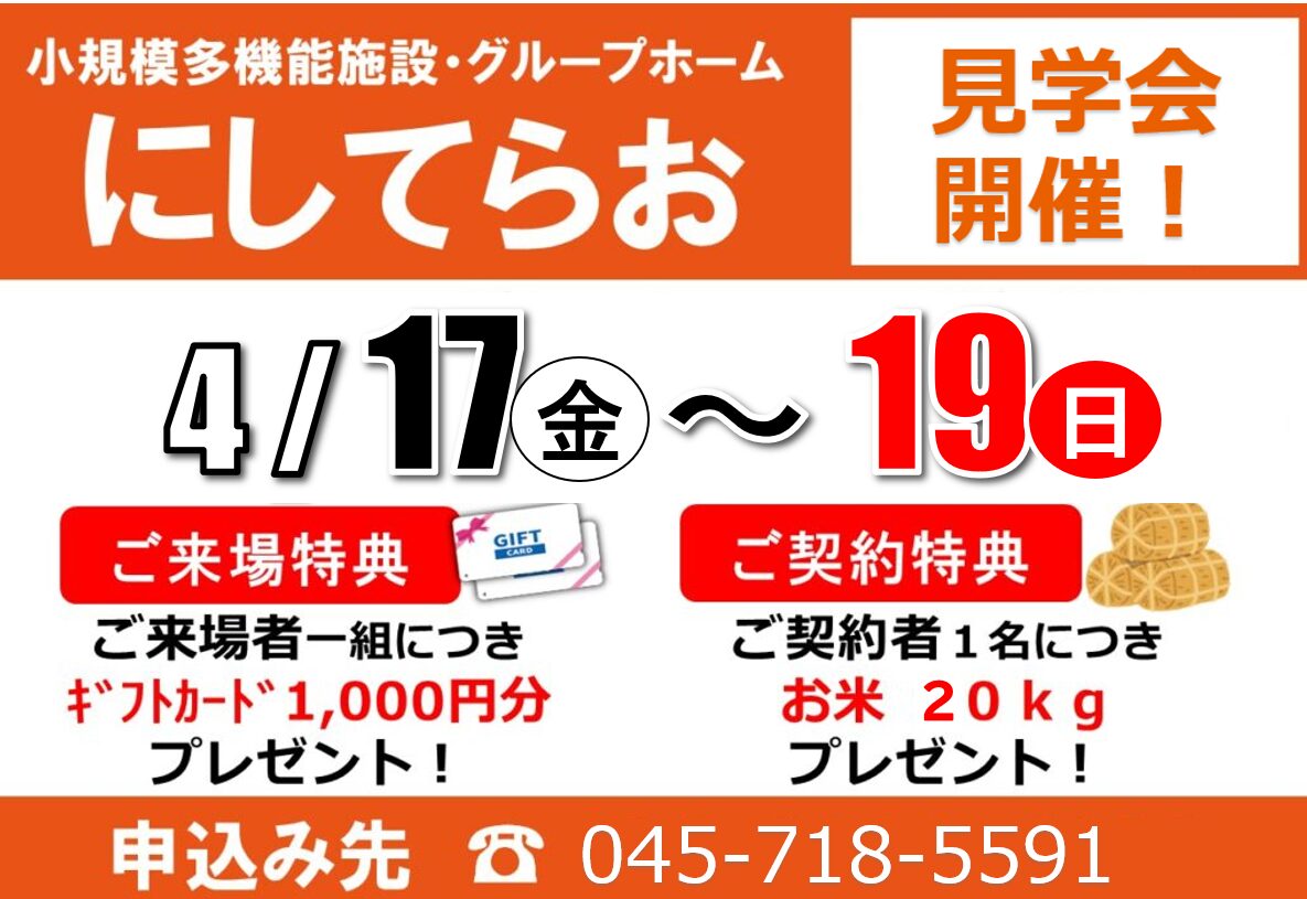 小多機にしてらお「見学会」開催(4/17(金)~19(日))