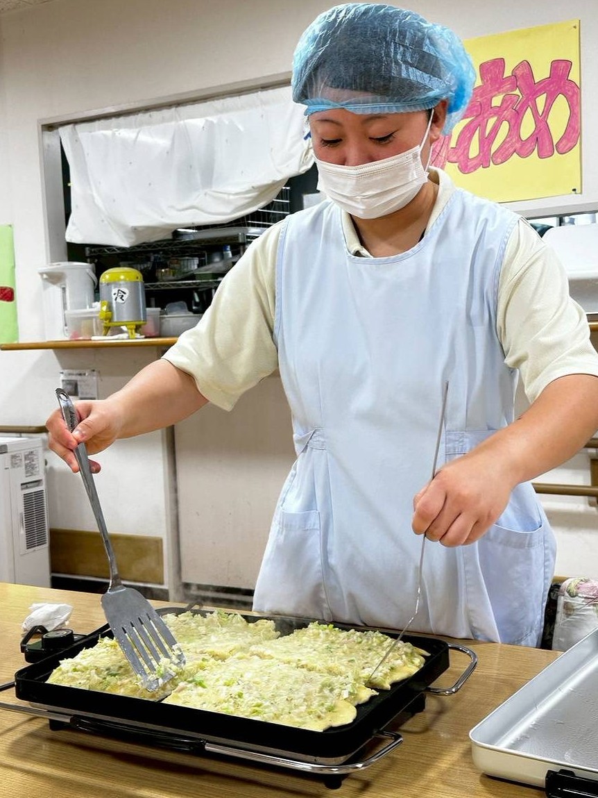 そしておやつの時間には、職員が利用者様の前でお好み焼きを焼くパフォーマンスも行いました。