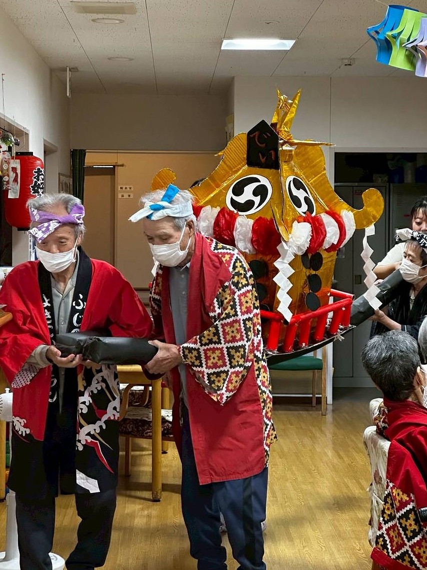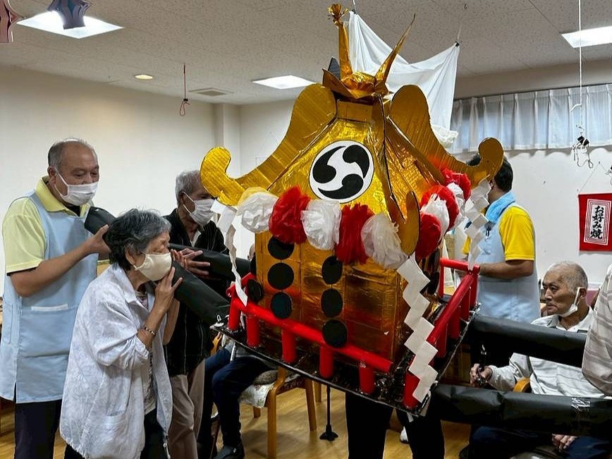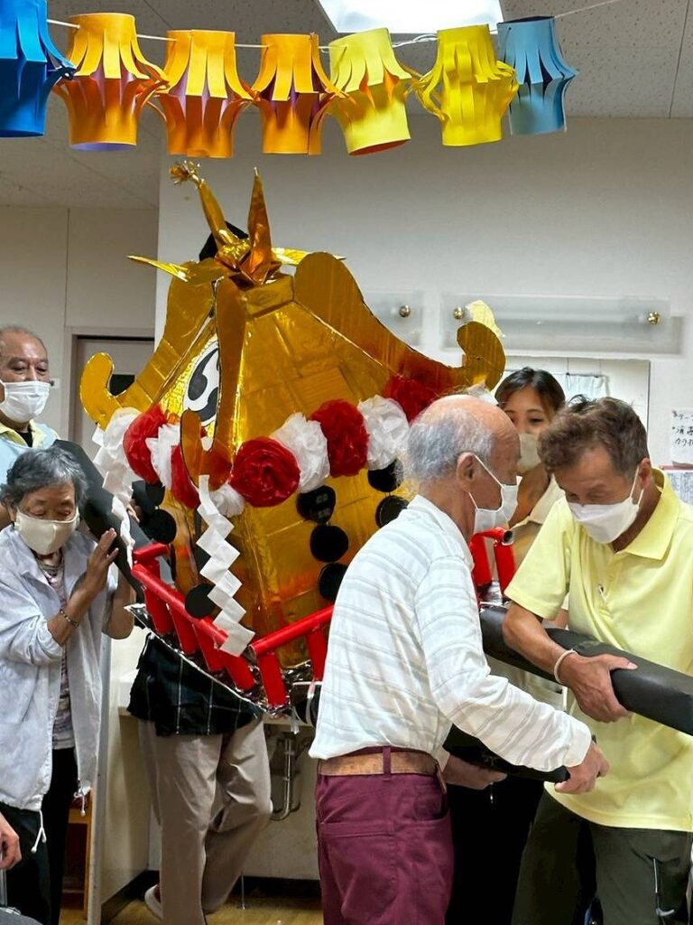 おやつの後は、利用者様と職員とで一緒に作ったお神輿を担ぎながら、