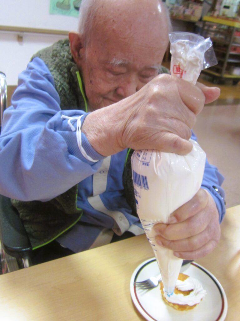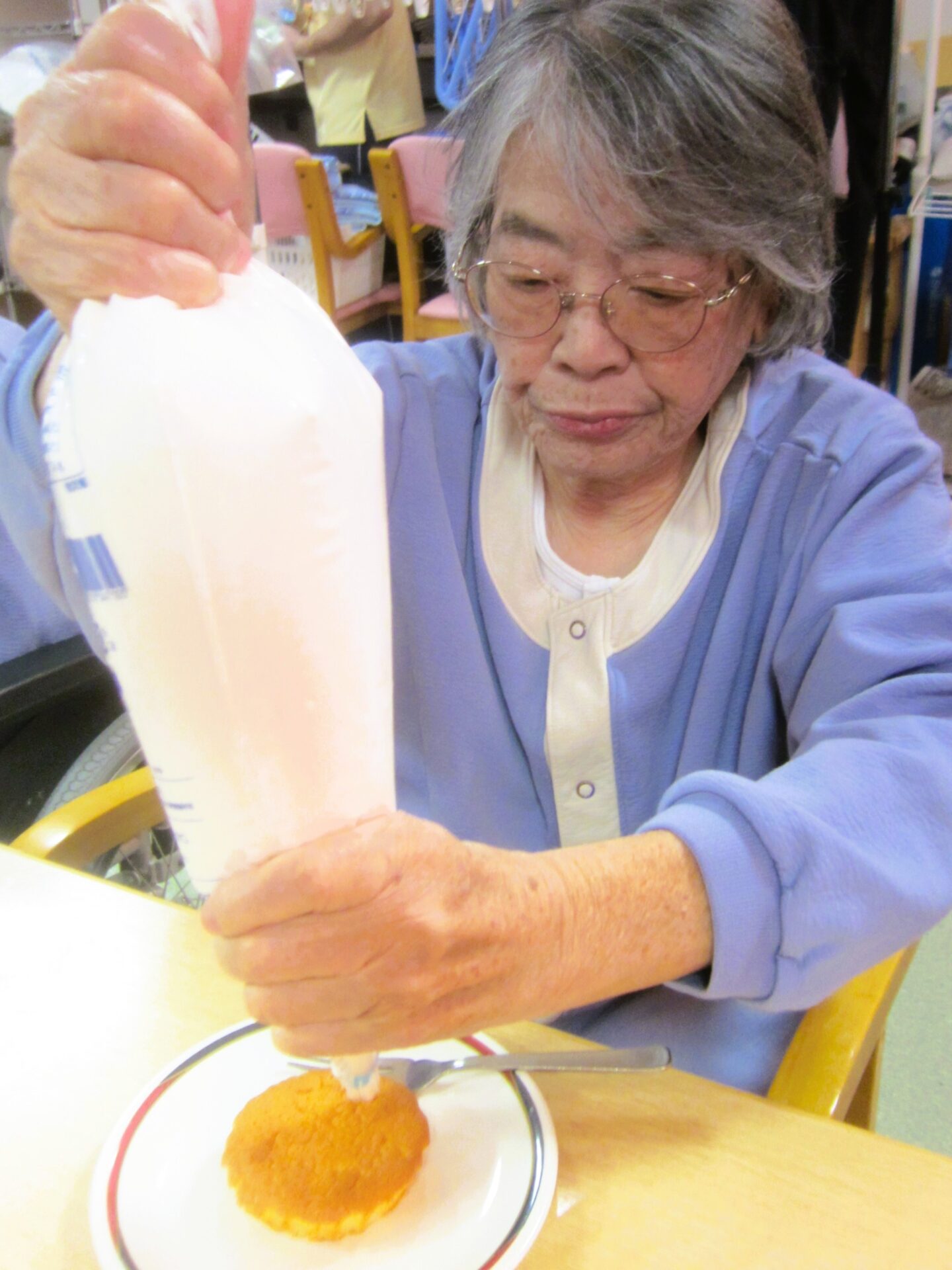 ホイップクリームを丁寧に絞る利用者様の真剣な表情がとても印象的でした。