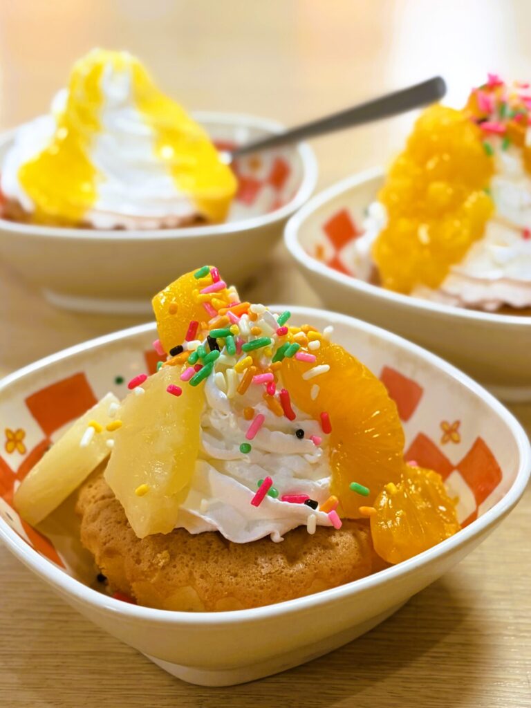 まずはホイップクリームを絞り、その上にみかんやパイナップル、
